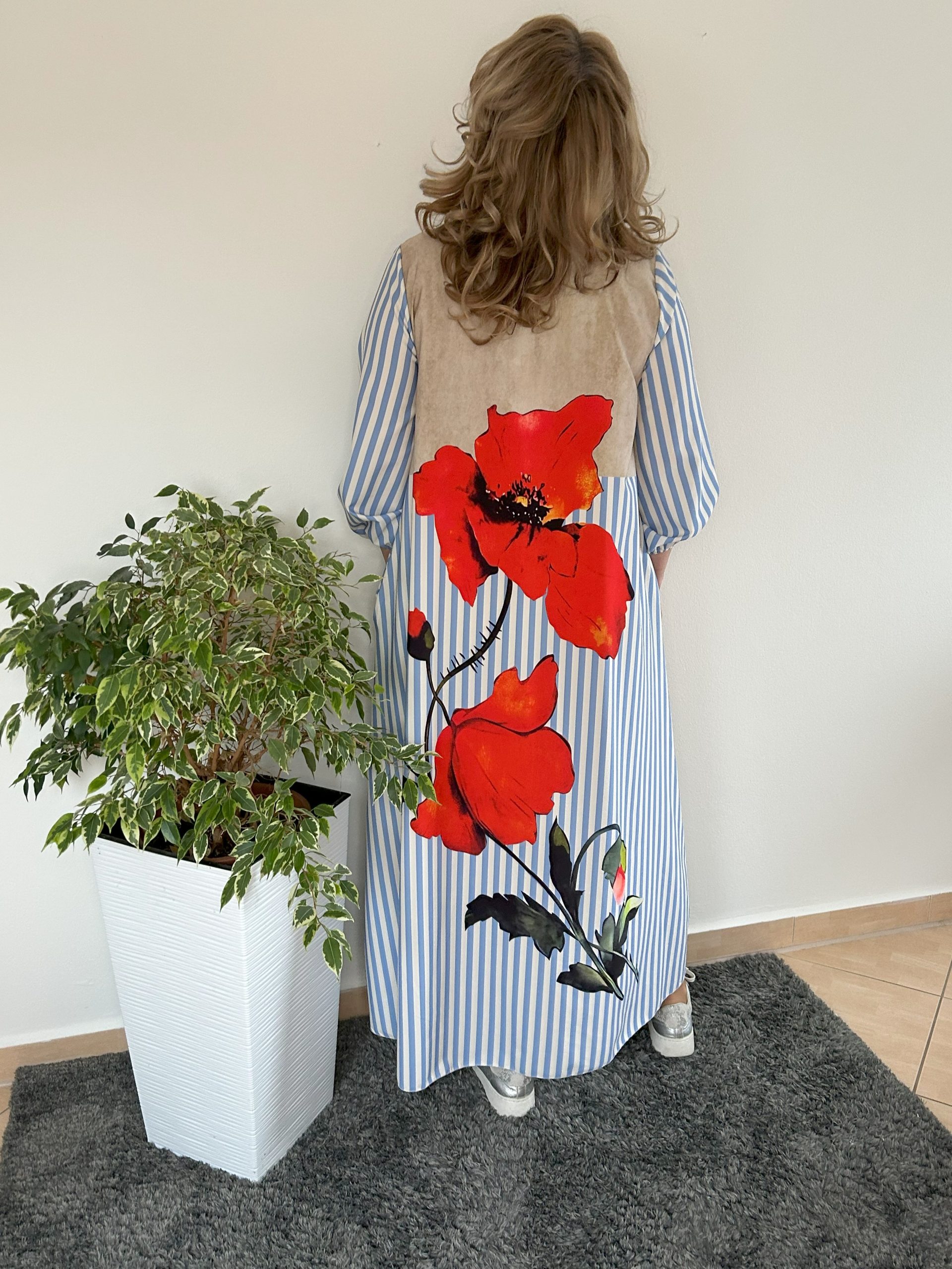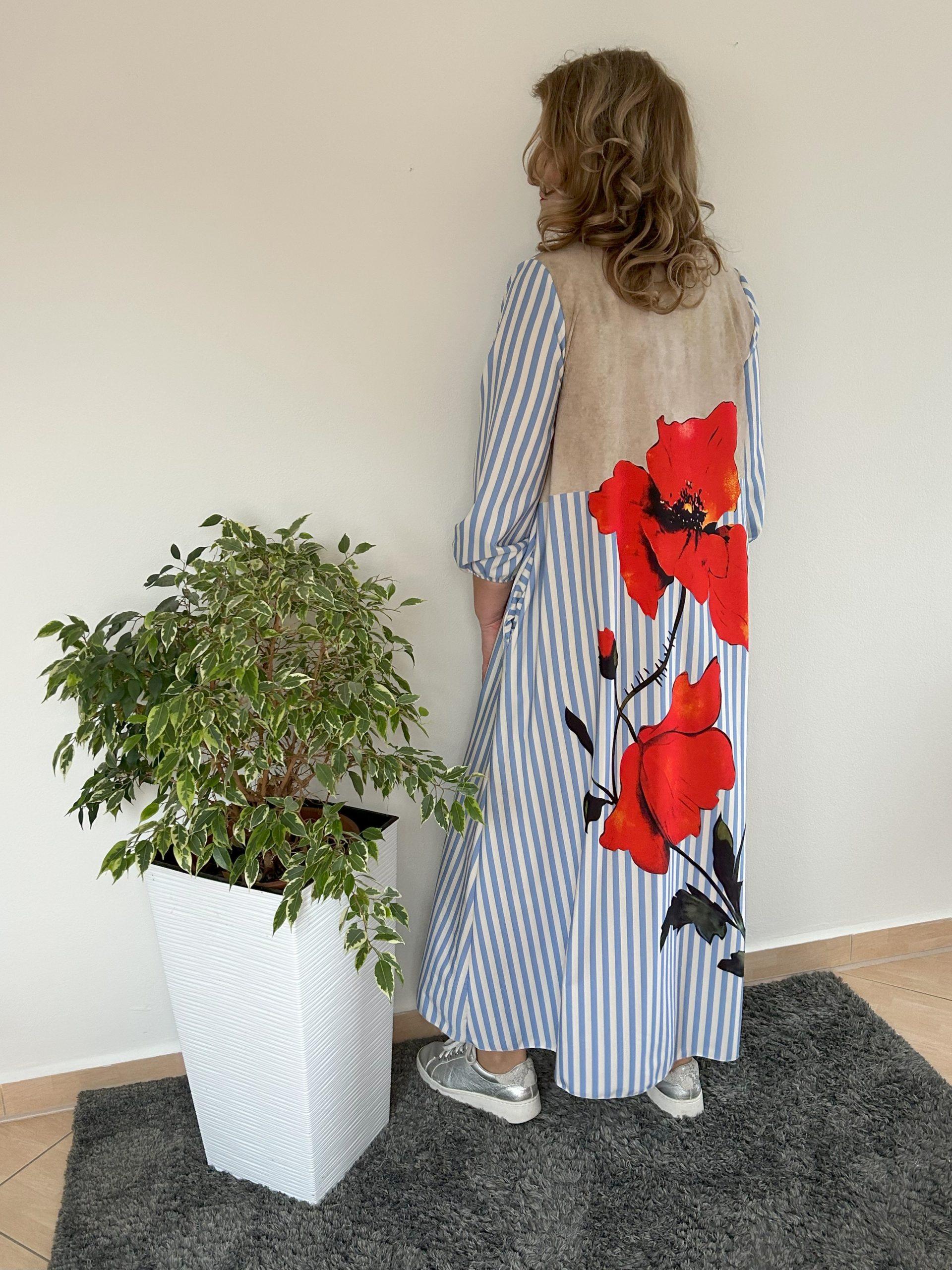 šaty rozšířené,rukávy stažené gumičkou, v bokách kapsy.