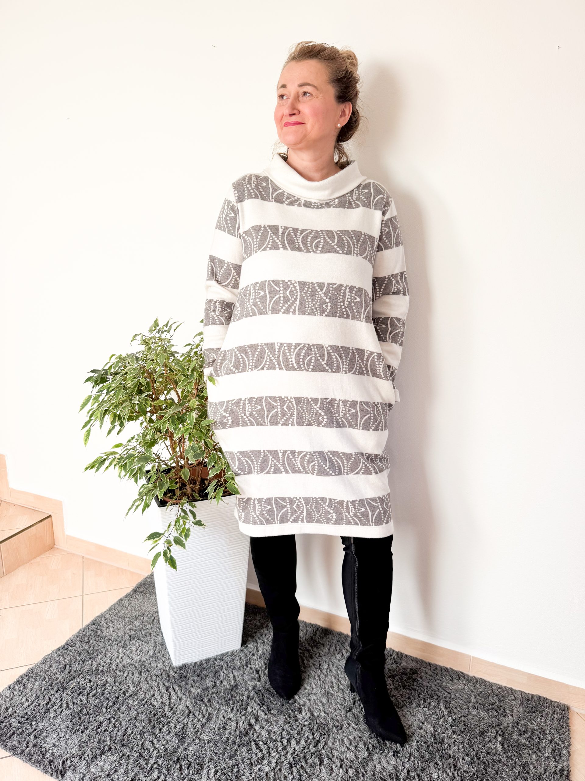 šaty projmutého střihu s kapsami, ohrnovací rolák.